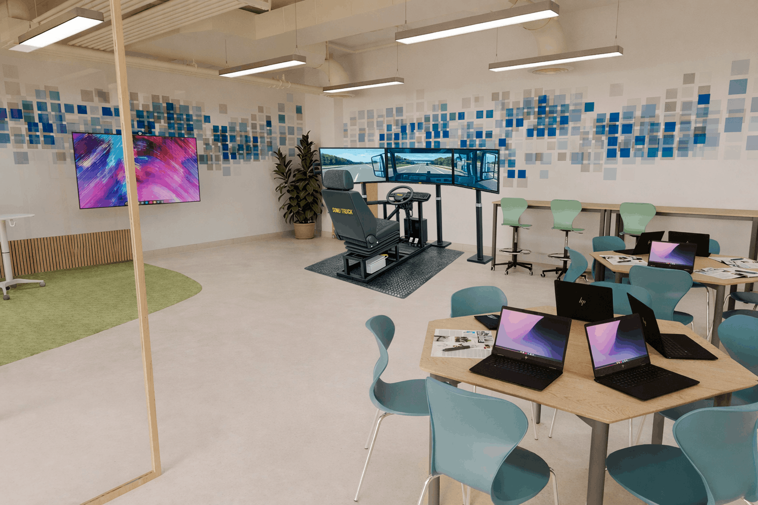 SimuTruck en Aulas ATECA es una solución de simulación inmersiva aplicada a la Formación Profesional, diseñada para integrarse en los nuevos espacios de Aulas de Tecnología Aplicada (ATECA) impulsados por el Ministerio de Educación y financiados con fondos europeos Next Generation.
